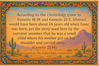 The pericope begins with Abraham sending Hagar and Ishmael into the wilderness in compliance with Sarah’s demand. Although the text offers no explicit commentary on Abraham’s emotional state, the brevity and austerity of the description suggest an episode of considerable internal conflict, particularly given Ishmael’s status as Abraham’s firstborn and long-expected son. The narrative then depicts Ishmael in terms that evoke the vulnerability of an infant or small child. Hagar is described as carrying him, and when the water supply is exhausted, she places him under a bush, distancing herself so as not to witness his anticipated death. These details align closely with portrayals of Ishmael in later Islamic tradition, where he is understood to be a young child during the desert episode associated with the origins of Mecca.